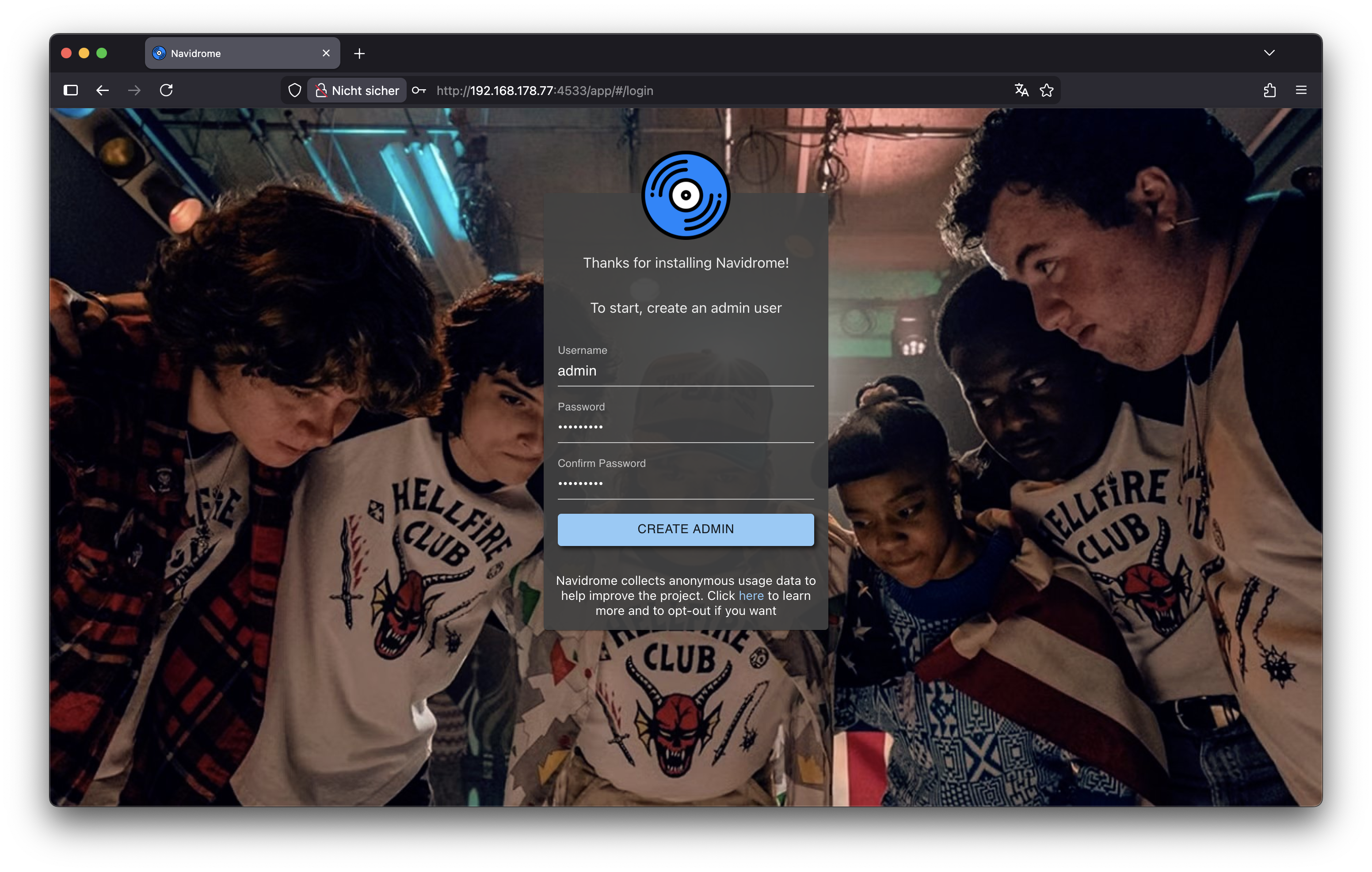 Zuhause kann ich das Webinterface von Navidrome mit der internen Netzwerk IP + dem Port 4533 im Browser aufrufen und mein Adminkonto erstellen.